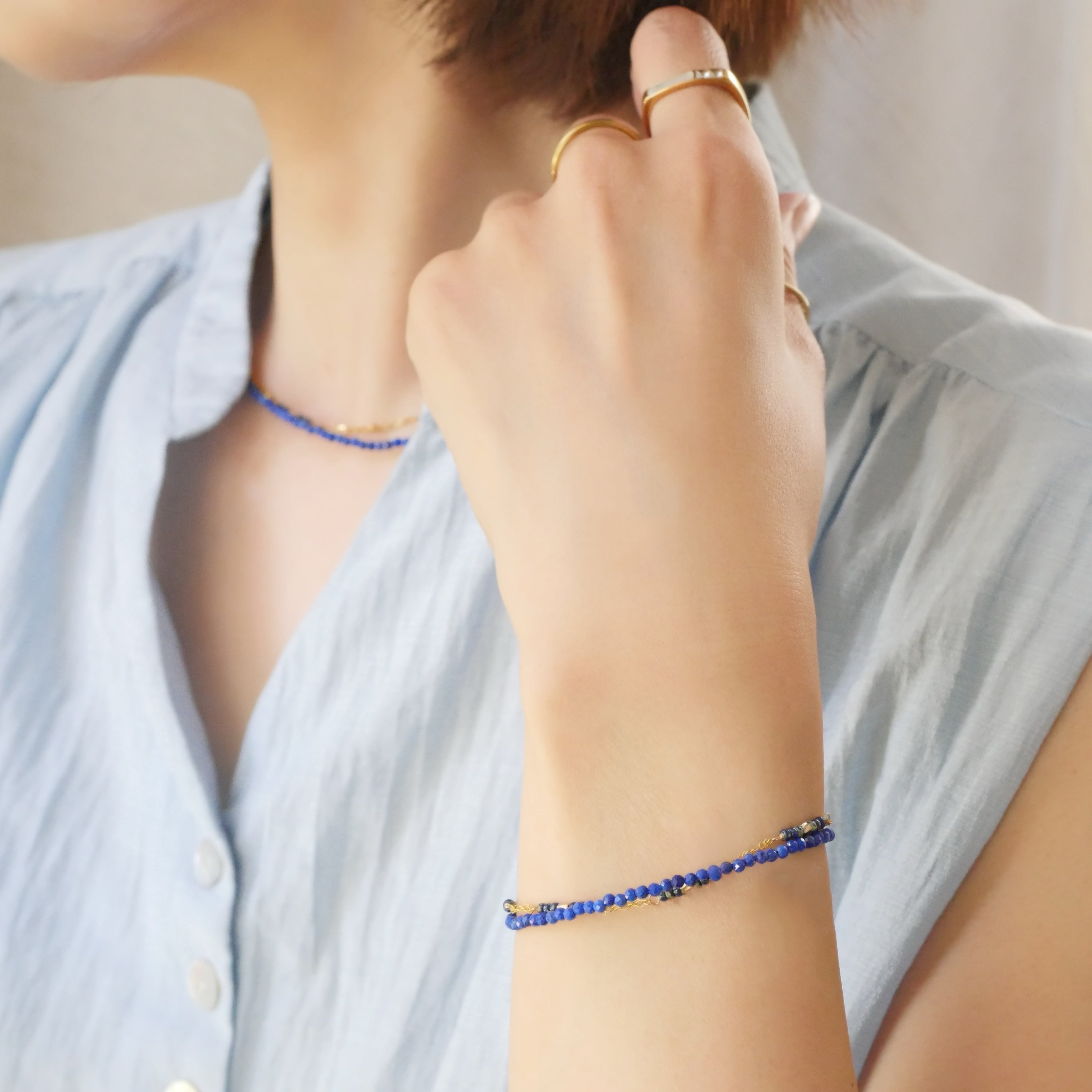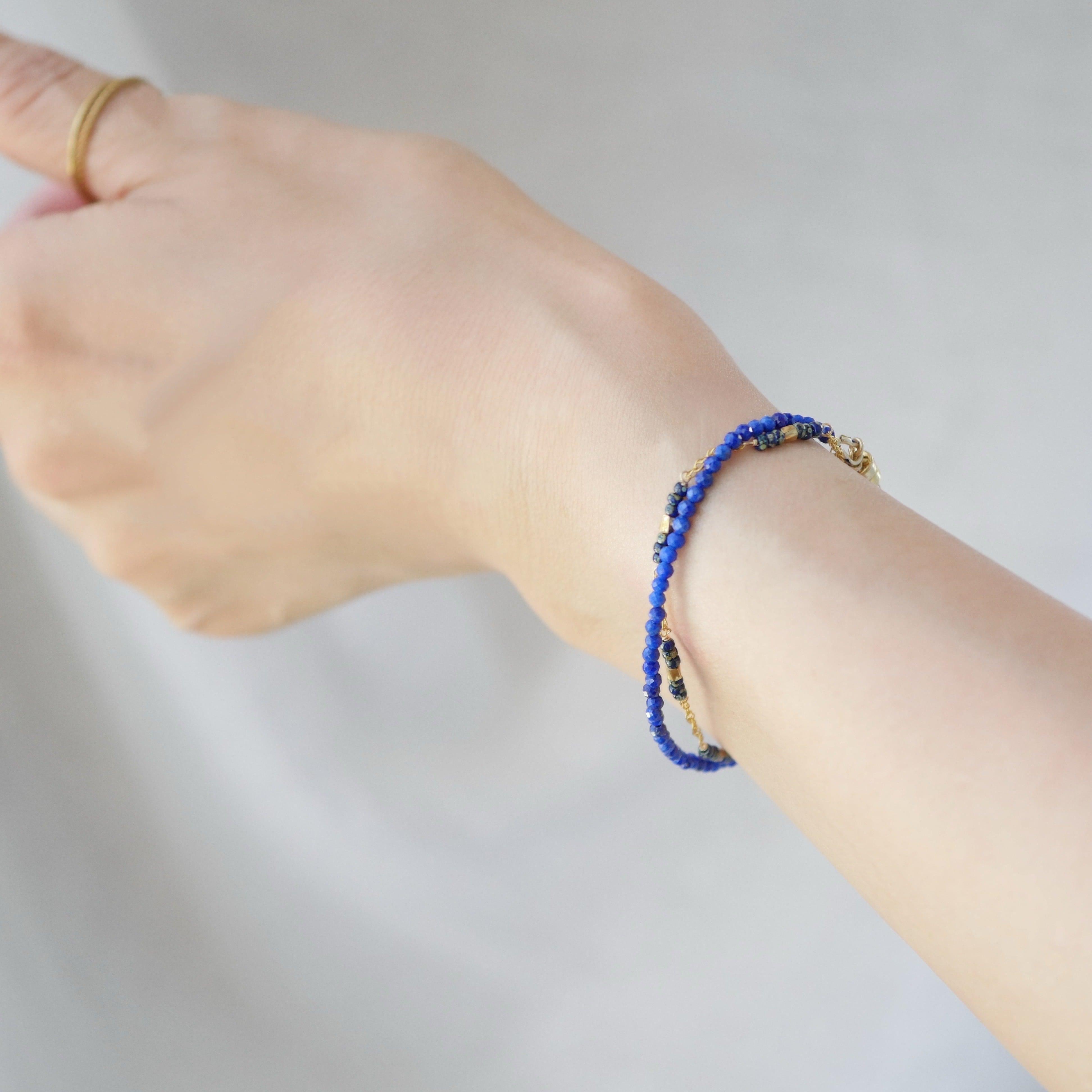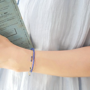 【片手で着脱OK】極小ラピスラズリとガラスビーズの2連レイヤードブレスレット 14kgf マグネット 夏アクセ ビーズ