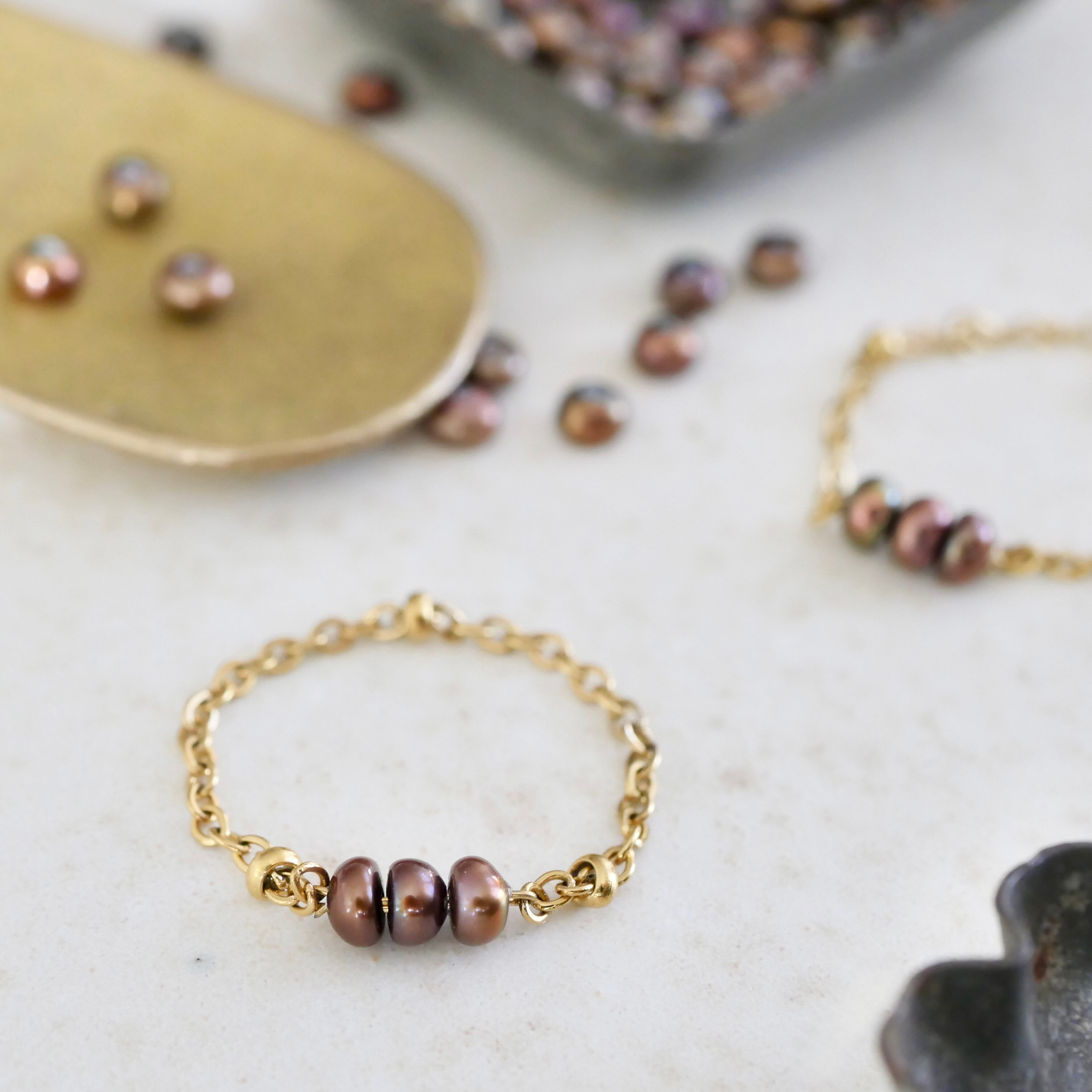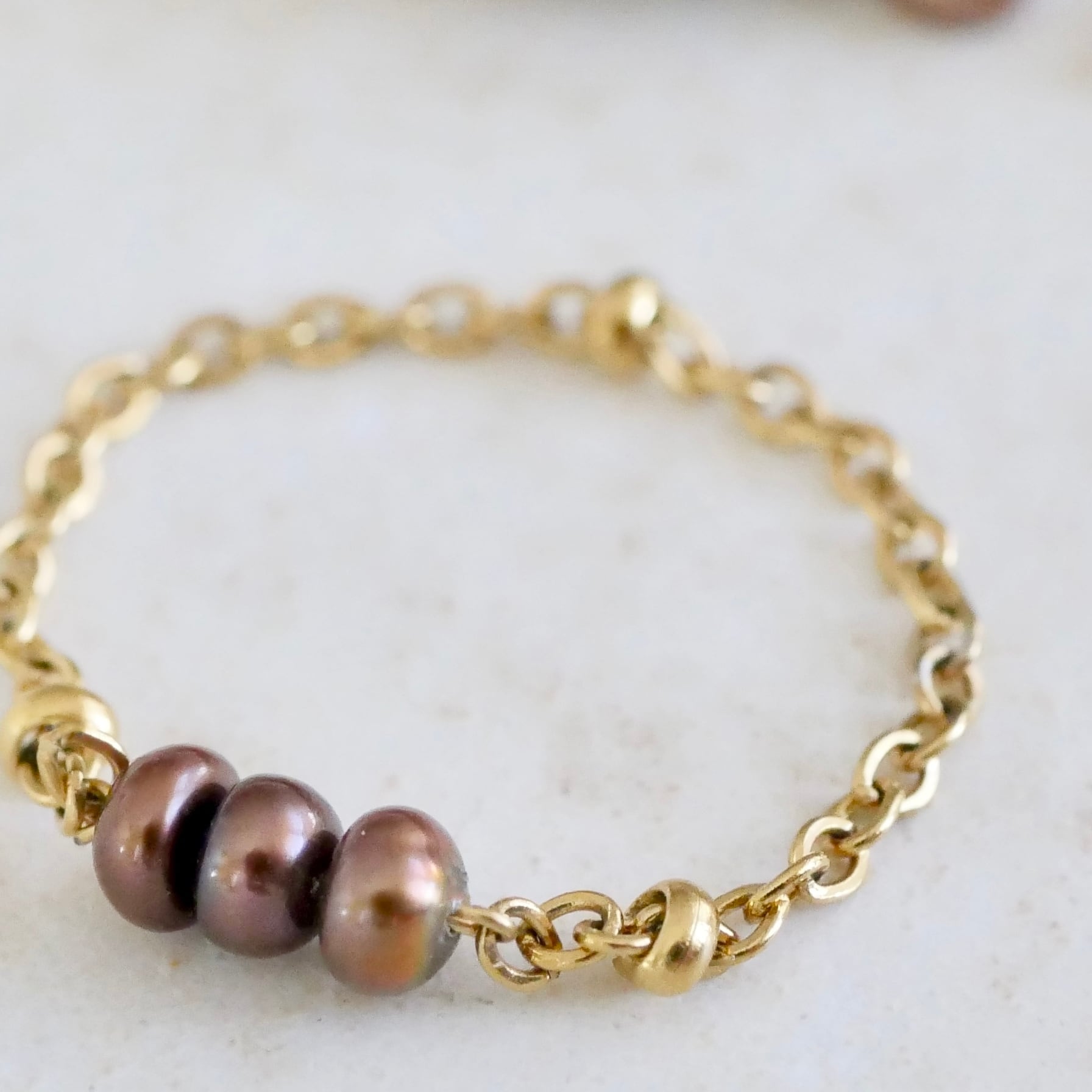淡水パール チョコレートブラウン チェーンリング サージカルステンレス316L 金属アレルギー対応 フリーサイズリング ピンキーリング 重ね付けリング 秋色アクセサリー 華奢リング 大人上品ジュエリー シンプルリング 誕生日プレゼント クリスマスギフト 数量限定 秋リング