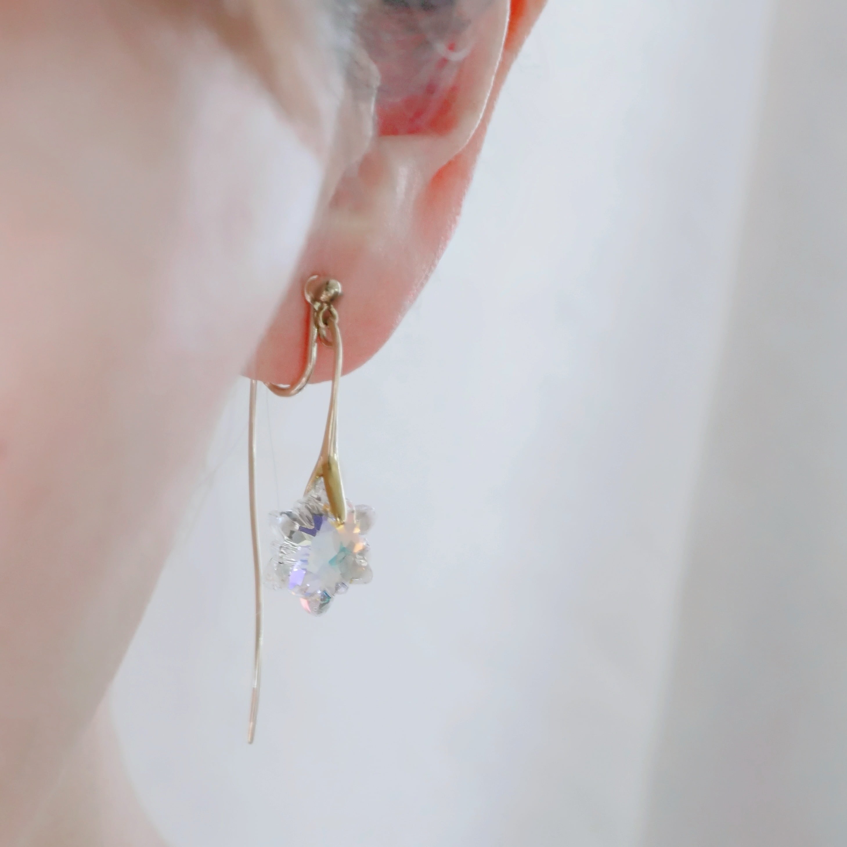 小さな雪の結晶が、冬の光を受けてそっと輝くピアス。