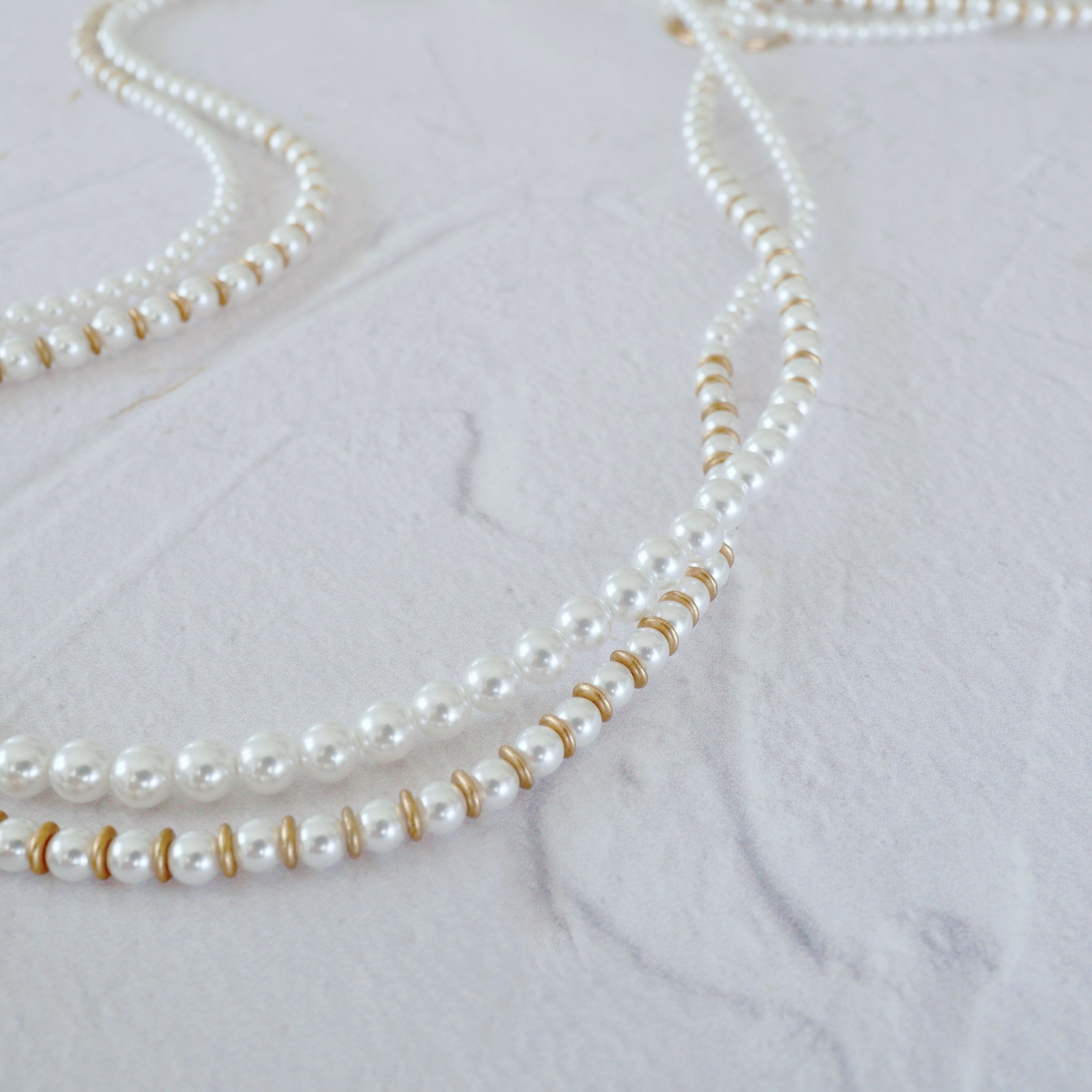 軽やかに重なり合う2連パールが、軽やかなロングパールネックレス。