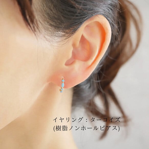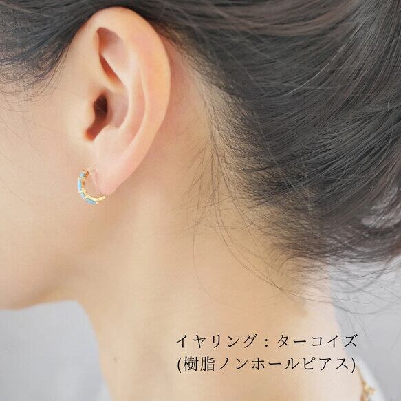 イヤリングは樹脂ノンホールピアス仕様となり、