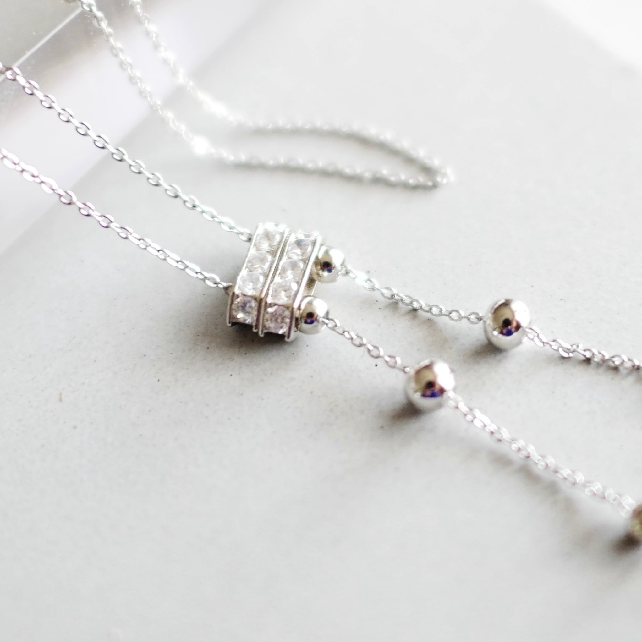 サージカルステンレス〇ジルコニアのスライド式ロングネックレス(シルバー) Y字ロング ラリエット 金属アレルギー対応